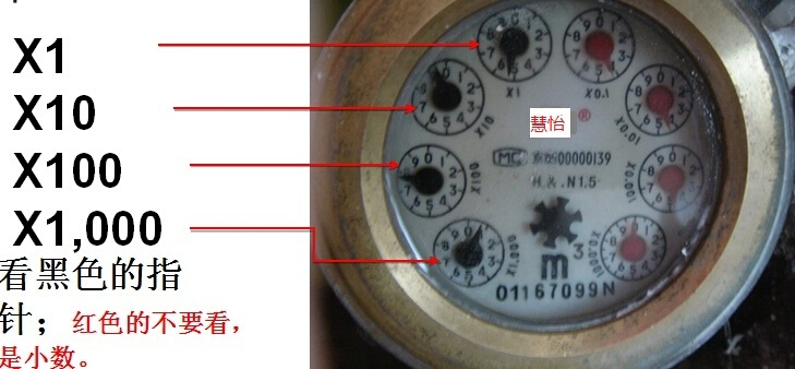 老式的水表分为四个小黑表和四个小红表,顺时针分别为: 1000/100/10/1/0.1/0.01/0.001/0.0001。黑表表示大于一吨,红表表示小于吨。比方说这8个小表上指针所指的数字分别为:1,2,3,4,5,6,7,8。那么水的吨数为:1234.5678吨。