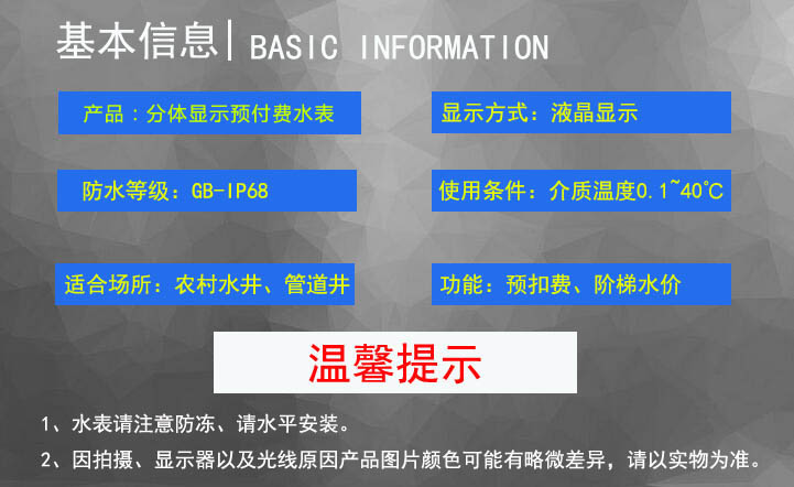 分体显示预付费水表是一款针对农村地区回水井、管道井研发的一款防水水表,基表部分及数据读写显示部分通过外引线连接,基表部分浸入水中,刷卡部分放置于井外,达到井下安表、井外刷卡的效果,IP68防水功能技术强,此水表为智能水表,采用大液晶屏显示,数字清晰,便于读取。水表表玻璃采用透明高强度有机玻璃,防止外来物品的损害。一户一表,凭卡用水,卡中数据输入表中,水表自动开阀供水,用完后自动关阀断水,必须重新购水,方能重新用水。IC卡还能记录表的运行情况,在管理机或管理软件下将表的总用水量、总购水、开关阀状态等信息进行管理。分体显示预付费水表可以提高管理效率,有效防止欠费,避免上门抄表,实现节约用水。