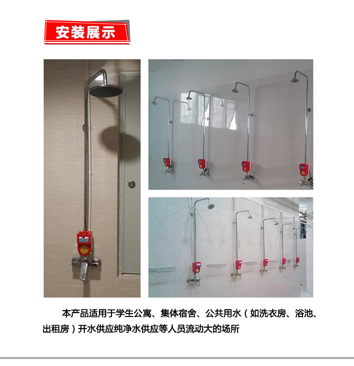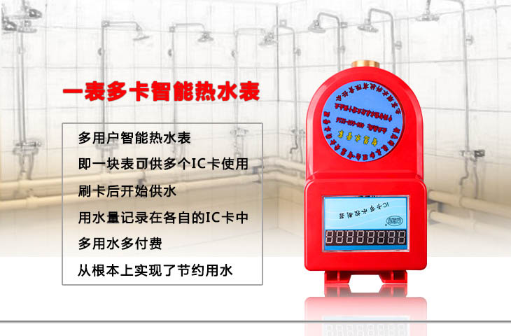一表多卡IC卡智能水表又称为多用户水表,是水表生产厂家为了供给学校、浴室、出租房等这样人口众多的公共场所而研发的智能仪表。该产品适应了“个人主观节水,用水计费到人”的要求,到主观节水的目的。缴费购水,凭卡用水。放置ic卡,水表阀开,开始供水(供水后将卡取走),用水后再次放置ic卡,水表阀关,停止供水,同时ic卡将水表中的信息取走,用水量记录在各自的卡中。少用水少付费,调动了人的节水意识。
