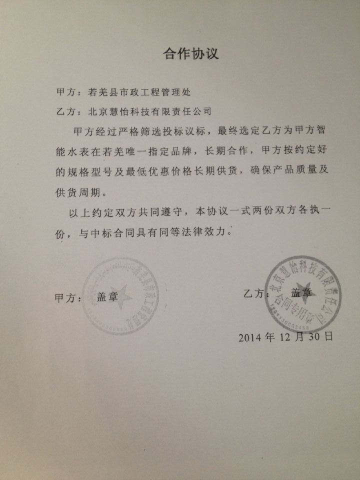 非常高兴能与新疆若羌县市政工程管理处长期合作,公司会更加努力生产技术更先进,质量更上乘的智能防水水表供应给广大用户。