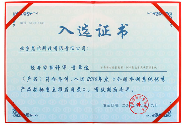 为了推动水利的现代化建设,全面贯彻落实中央关于水利改革发展的决策部署和国家发展改革委、水利部关于加快推进重大水利工程建设视频会议的精神。结合水利部《水利工程建设项目重要设备材料采购招标投标管理办法》中的有关规定。同时也为了进一步规范和搭建全国水利系统产品招标和选购工作的媒体平台。中国水利水电出版社成立水利专家评审委员会,对自愿申请入选《全国水利系统优秀产品招标重点推荐目录》进行了全面的评审。中国智能水表实力品牌——北京慧怡科技旗下产品水资源智能控制器、IC卡智能水表及管理系统入选2016年度《全国水利系统优秀产品招标重点推荐目录》。