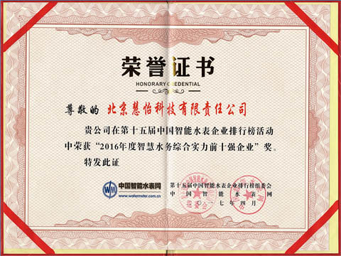 由中国智能水表网举办的第十五届中国智能水表企业排行榜已经落下帷幕,经过建筑部中国城科会智能水表工作部专家、中国智能水表网编委、知名企业、会员代表等评委公正公平评定下,北京慧怡科技有限责任公司凭借优质的产品质量和完善的售后服务体系获得“2016年度智慧水务综合实力前10强企业”以及“2016年度智慧水务最具价值品牌”等荣誉称号。