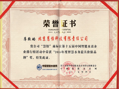 由中国智能水表网举办的第十五届中国智能水表企业排行榜已经落下帷幕,此次项目得到《中国供水节水报》、《城镇供水》杂质、新浪网、搜狐网等实力媒体的支持,经过建筑部中国城科会智能水表工作部专家、中国智能水表网编委、知名企业、会员代表等评委公正公平评定下,北京慧怡科技有限责任公司完美胜出,获得“2016年度智慧水务最具价值品牌”、“2016年度智慧水务综合实力前10强企业”等荣誉称号。