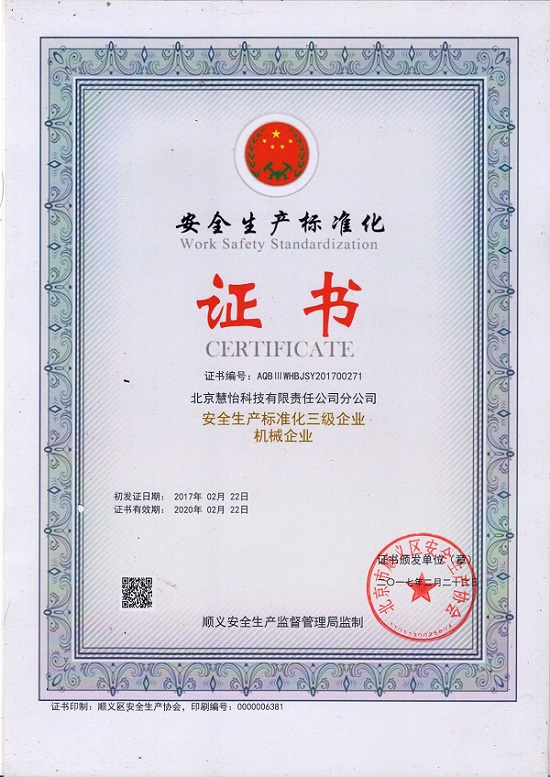 北京慧怡水表公司自97年成立以来,专心专注生产IC卡水表、预付费水表、远传水表以及高端物联网水表等等,始终把安全生产工作作为重中之重, 明确自身的安全主体地位,加大安全投入,认真落实国家及行业安全生产管理法规标准要求,强化全员安全生产教育培训,加大安全投入和检查整改力度。使得企业安全标准化体系建设符合国家规范要求,顺利通过了安全标准化三级考评验收并获相关证书。