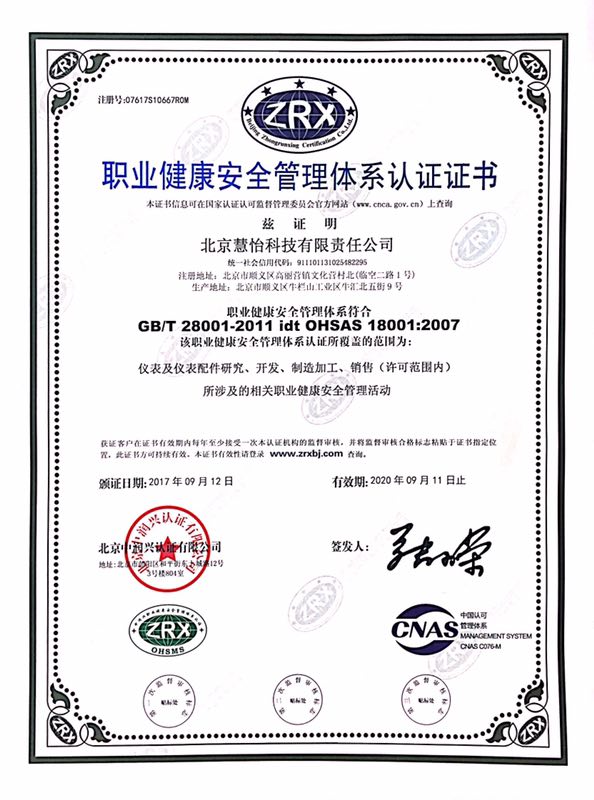日前,北京慧怡科技有限责任公司顺利通过了职业健康安全管理体系认证,并获得了职业健康安全管理体系认证证书,标志着慧怡水表公司管理向科学化、规范化、标准化迈进了一大步。