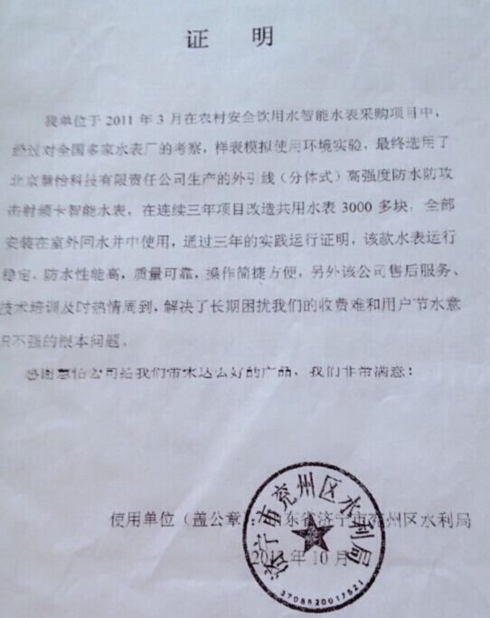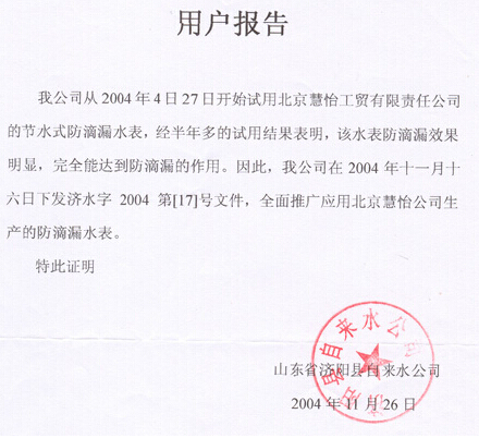 能说明慧怡水表公司的产品质量过硬的,就是智能防水水表用户的反映。例如,在济宁兖州进行的农村水改工程,共采用慧怡的智能防水水表3000块,用户反映水表的质量过硬,运行十分稳定,防水性能高,质量可靠,操作简单方便。当然,好的不只是慧怡公司的智能防水水表,还有防滴漏水表也深受用户的好评,2004年山东济阳的自来水公司,吸纳后采用慧怡公司的防滴漏水表50000块,经过实际应用,用户反映慧怡公司的防滴漏水表质量优异,运行稳定,防滴漏效果好,用户表示非常满意。